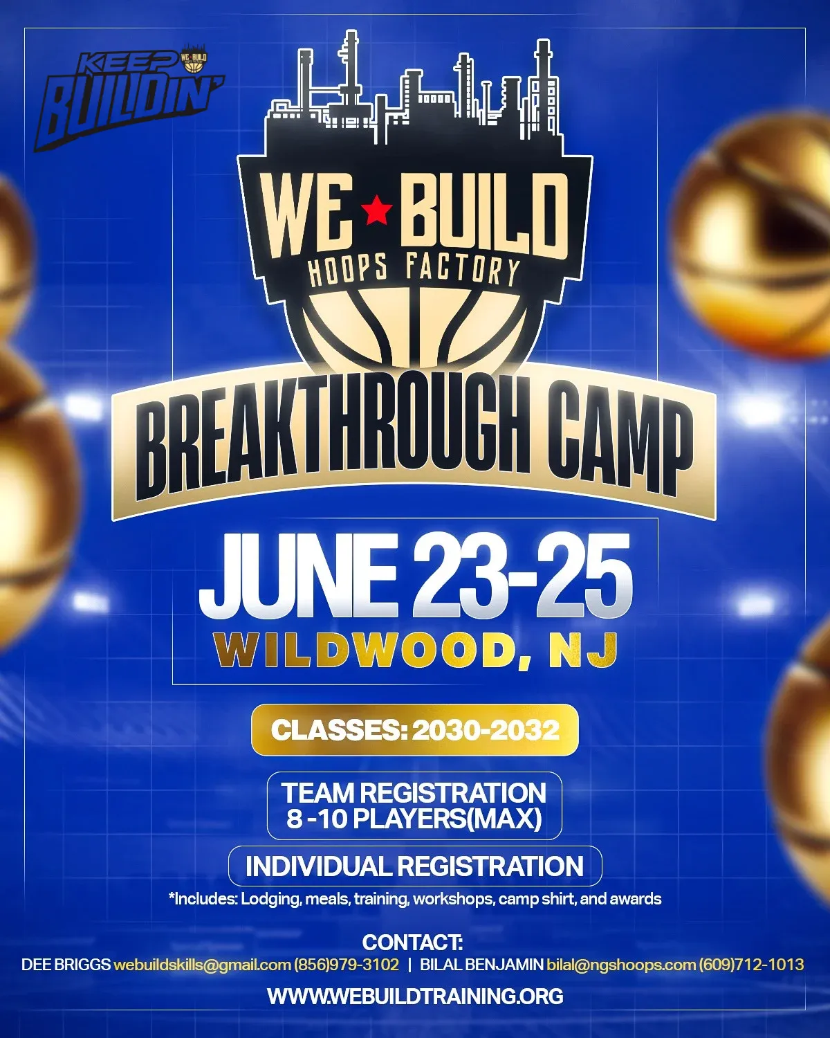The We BUILD Breakthrough Camp is a one‑of‑a‑kind overnight basketball experience designed for athletes who want to sharpen their skills, build confidence, and train in a competitive yet supportive environment. Held in Wildwood, NJ, this camp combines elite instruction, beachfront lodging, and a holistic approach to player development — blending fundamentals, advanced concepts, conditioning, and leadership training.